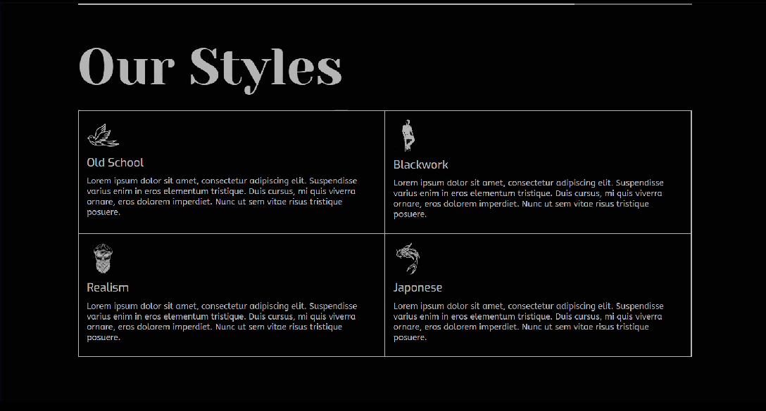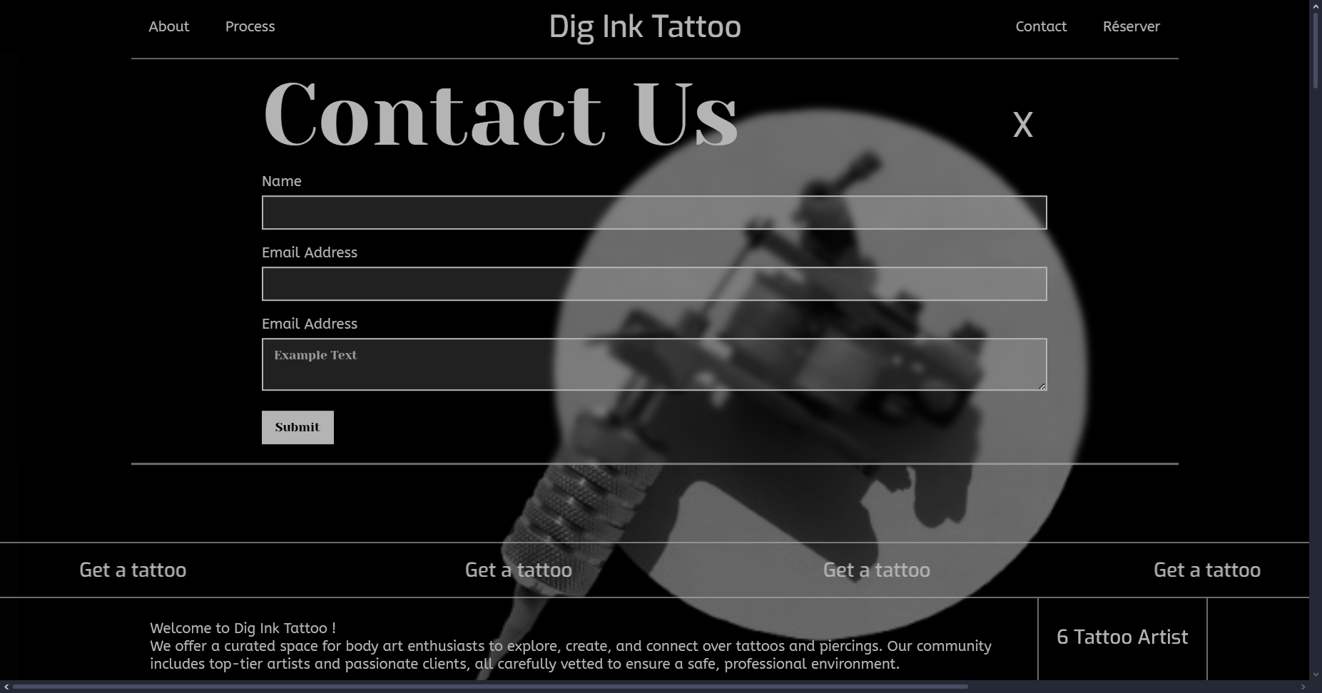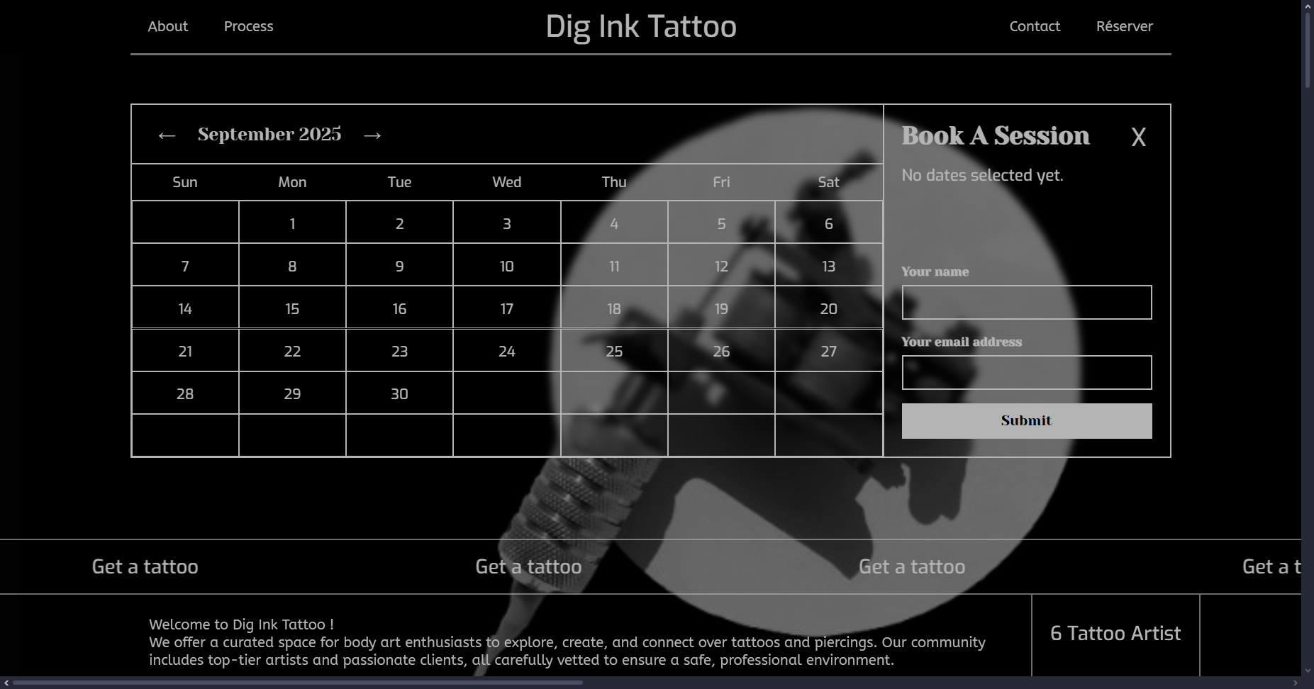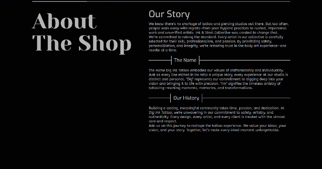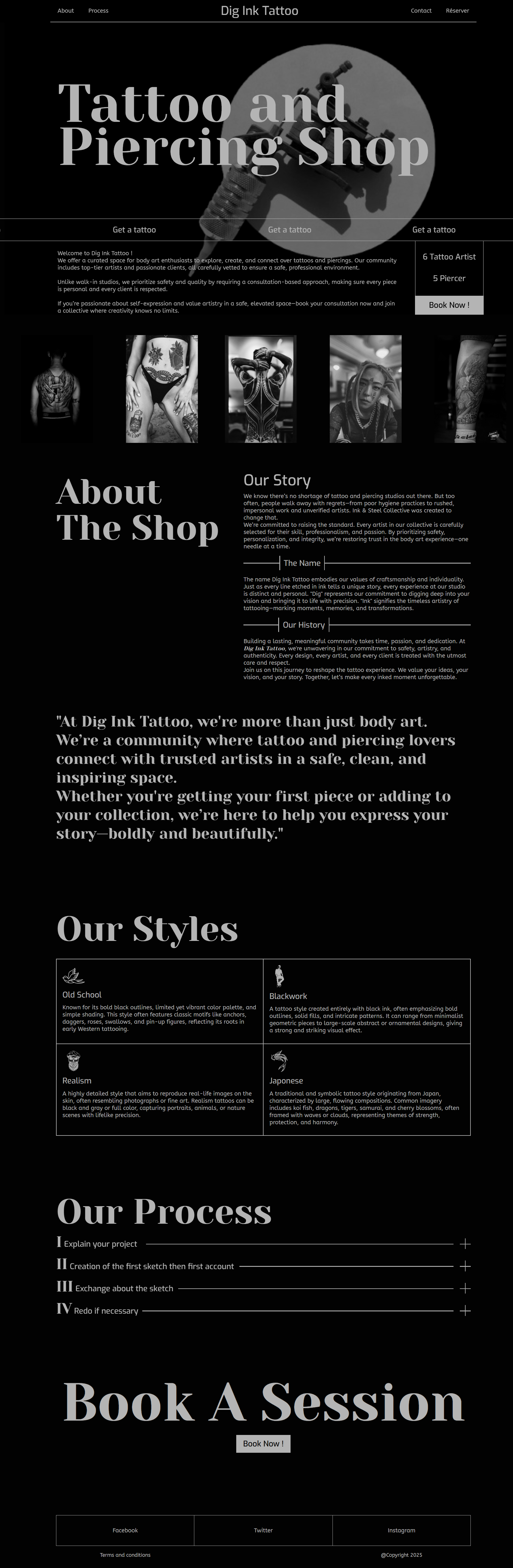 Un site au design minimaliste en noir et blanc, sublimé par des animations poussées mais maîtrisées, qui laisse l’espace nécessaire pour respirer et mettre en valeur l’essentiel : l’art du tatouage et la précision des tracés. La typographie principale, Yeseva One, apporte caractère et élégance, tandis que l’interface joue sur les contrastes pour offrir une navigation fluide et immersive. Ce minimalisme réfléchi reflète l’esprit du salon : authenticité, maîtrise et singularité. Chaque détail est pensé pour créer un univers digital épuré et percutant, où les œuvres respirent et invitent pleinement à la découverte de l’art corporel.