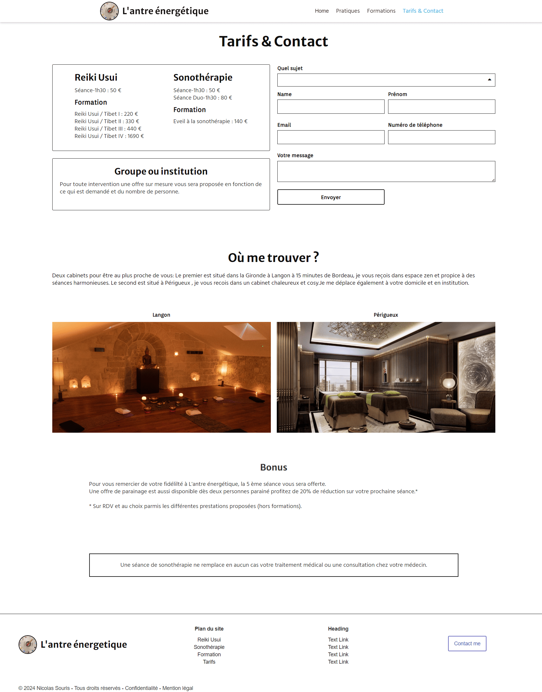 Un site minimaliste et apaisant qui reflète l'essence des pratiques holistiques proposées. L'interface privilégie les espaces blancs et une typographie claire pour créer une expérience utilisateur sereine et intuitive. L'approche minimaliste n'est pas qu'un choix esthétique, elle incarne l'essence même des pratiques holistiques : la clarté, la pureté et le retour à l'essentiel. Chaque élément est pensé pour créer un espace digital qui respire et qui invite à la sérénité.